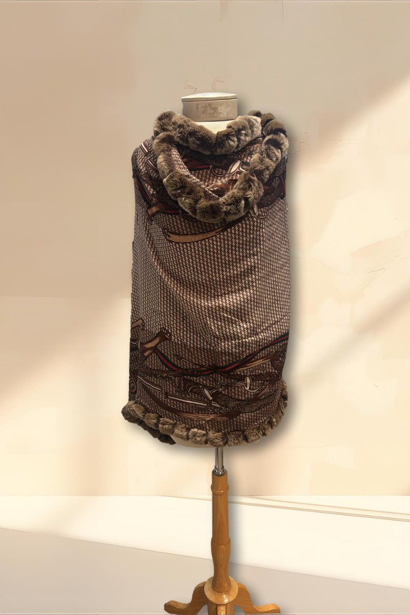 Chain Print Wrap with Rex Rabbit Fur in Camel
